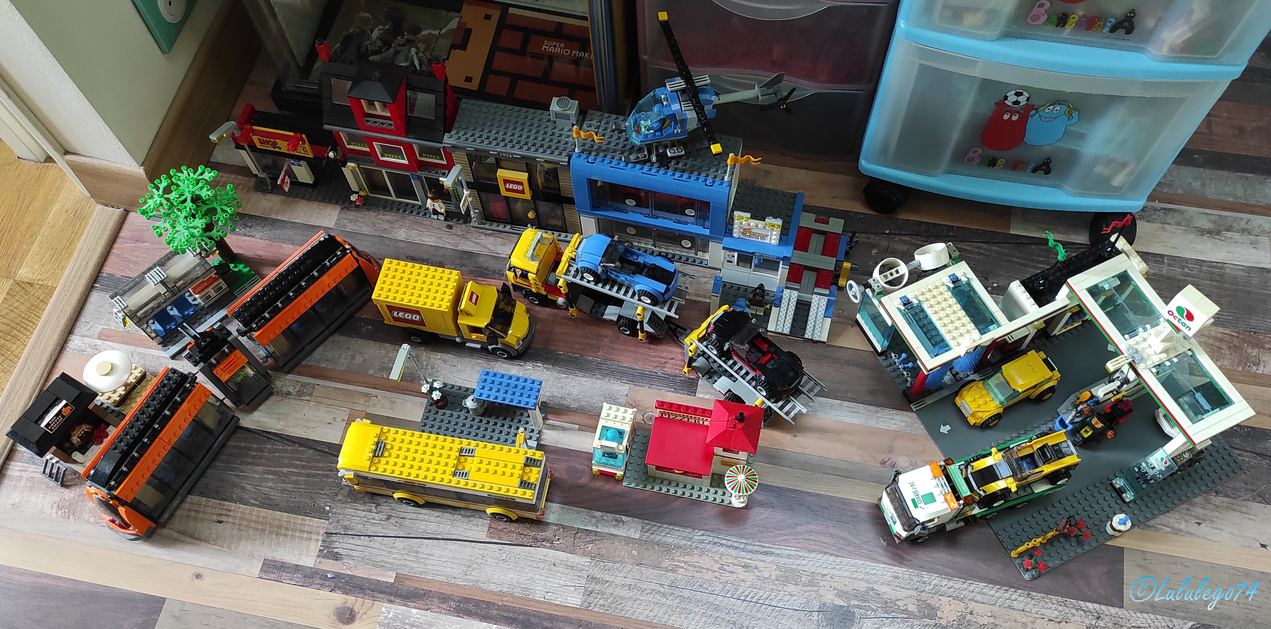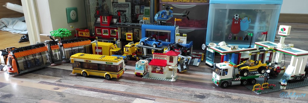 Comme il se doit dans chacune de nos trois villes Lego respectives, un centre-ville doit être présent. Là aussi aucun problème chez Lego pour trouver des sets Lego City pour le compléter année après année. Voici donc ce que contient le centre-ville de mon loulou :